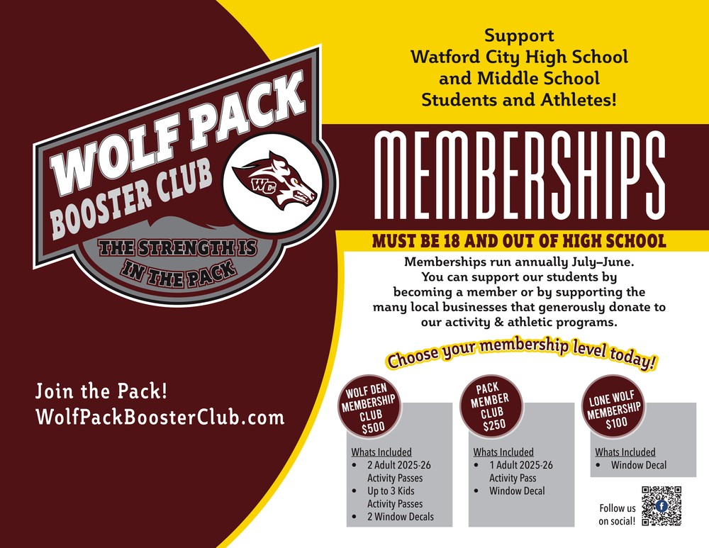 The purpose of the Wolf Pack Booster Club is to support all organized student activities at Watford City High School and Middle School, located in McKenzie County, North Dakota. The Club promotes academic, artistic, athletic, and extracurricular pursuits while fostering school spirit, community, and pride.